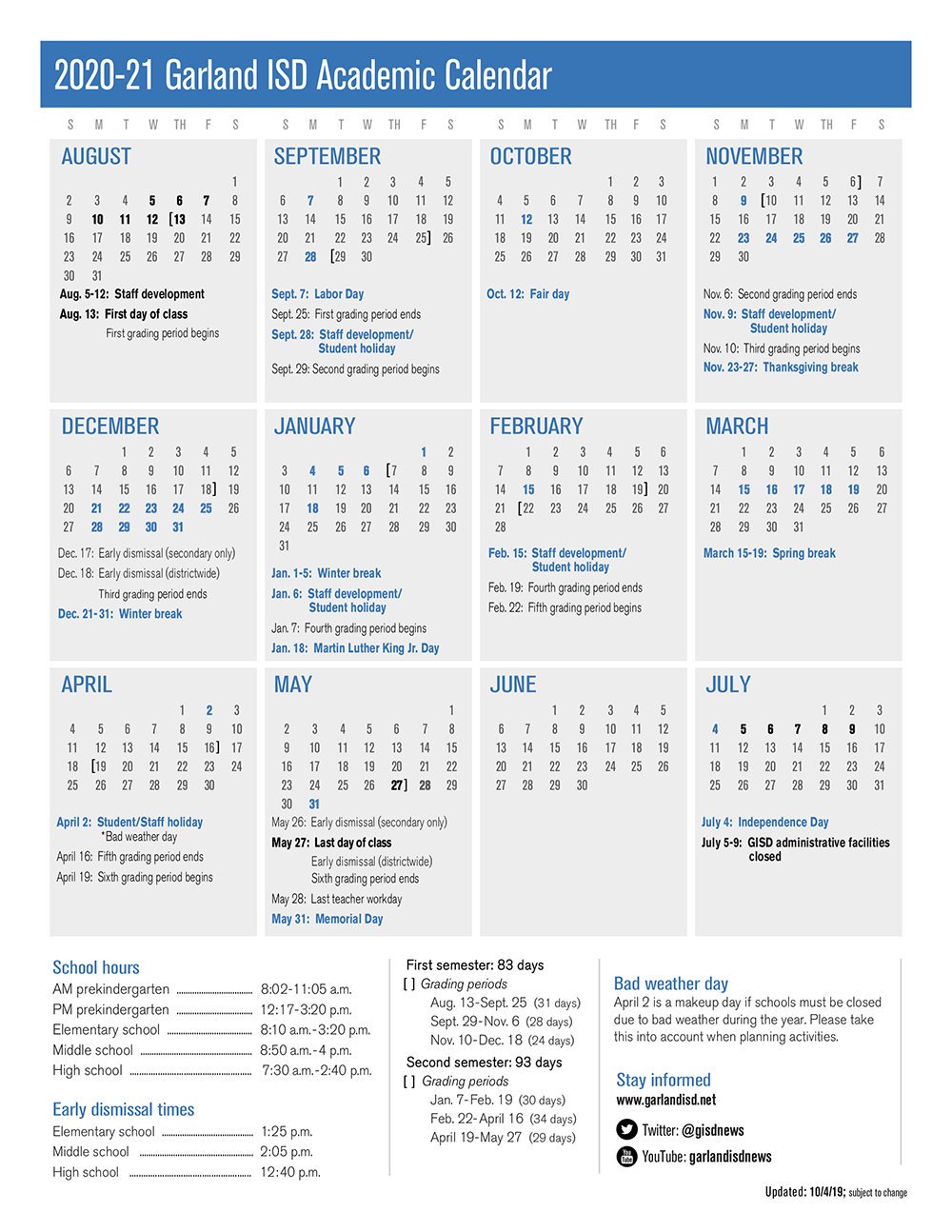Site Map Back to Top. This page contains the major holiday dates from the 2020 and 2021 school calendar for Galveston Independent School District in Texas. There will be no changes to Galveston ISD middle schools for the 2021-2022 school year.
